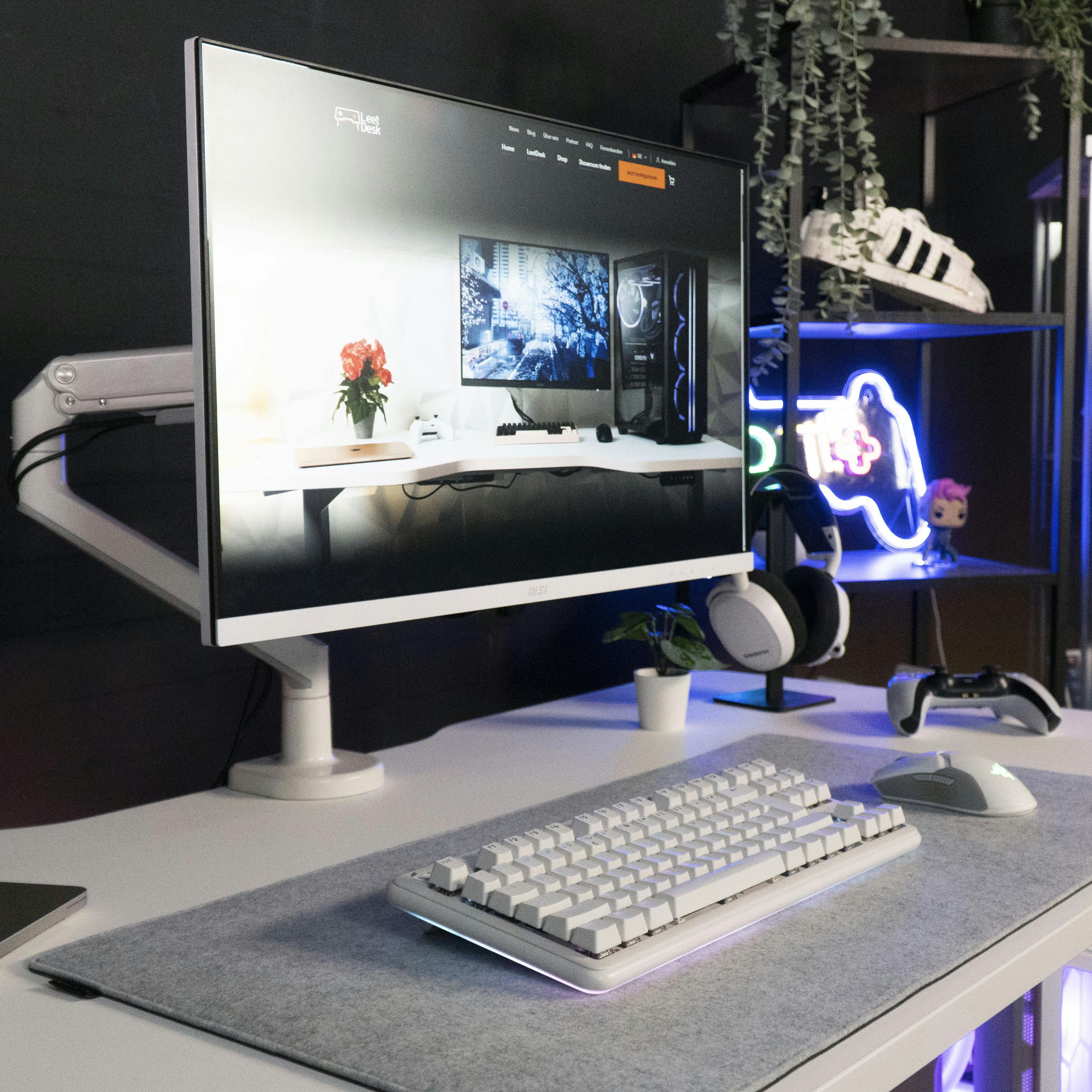 Gaming Tische in Weiß von LeetDesk. Elektrisch höhenverstellbar. Konfigurierbar.